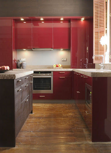 Contemporary Kitchen With Wine Red Gloss Lacquer Cabinets Lacquer Cabinets Contemporary Kitchen Kitchen